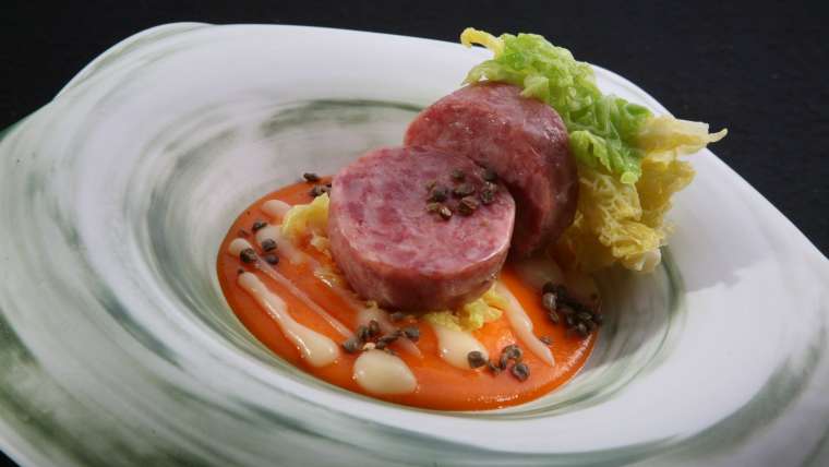 Cotechino, crema di zucca gialla, verza, spuma di patate e chips di lenticchie
