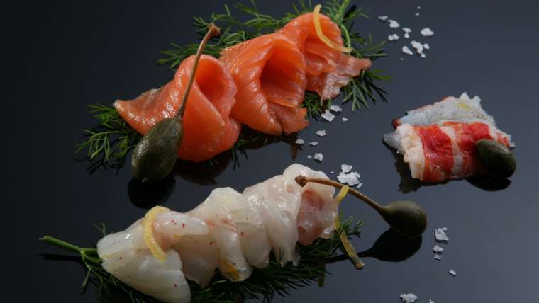 Crudo di branzino, salmone e astice con limone, peperoncino, finocchietto e capperi