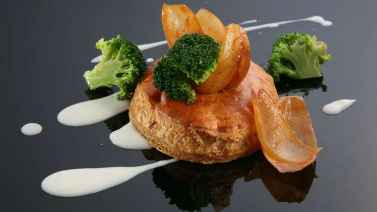 Sfoglia di cipolle caramellate, broccoli e fonduta di Taleggio