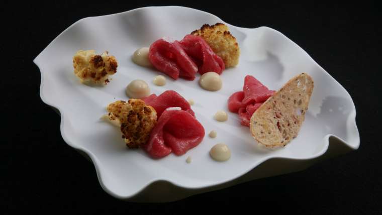 Millefoglie di manzo, croccante di pane, cavolfiore arrosto e la sua crema