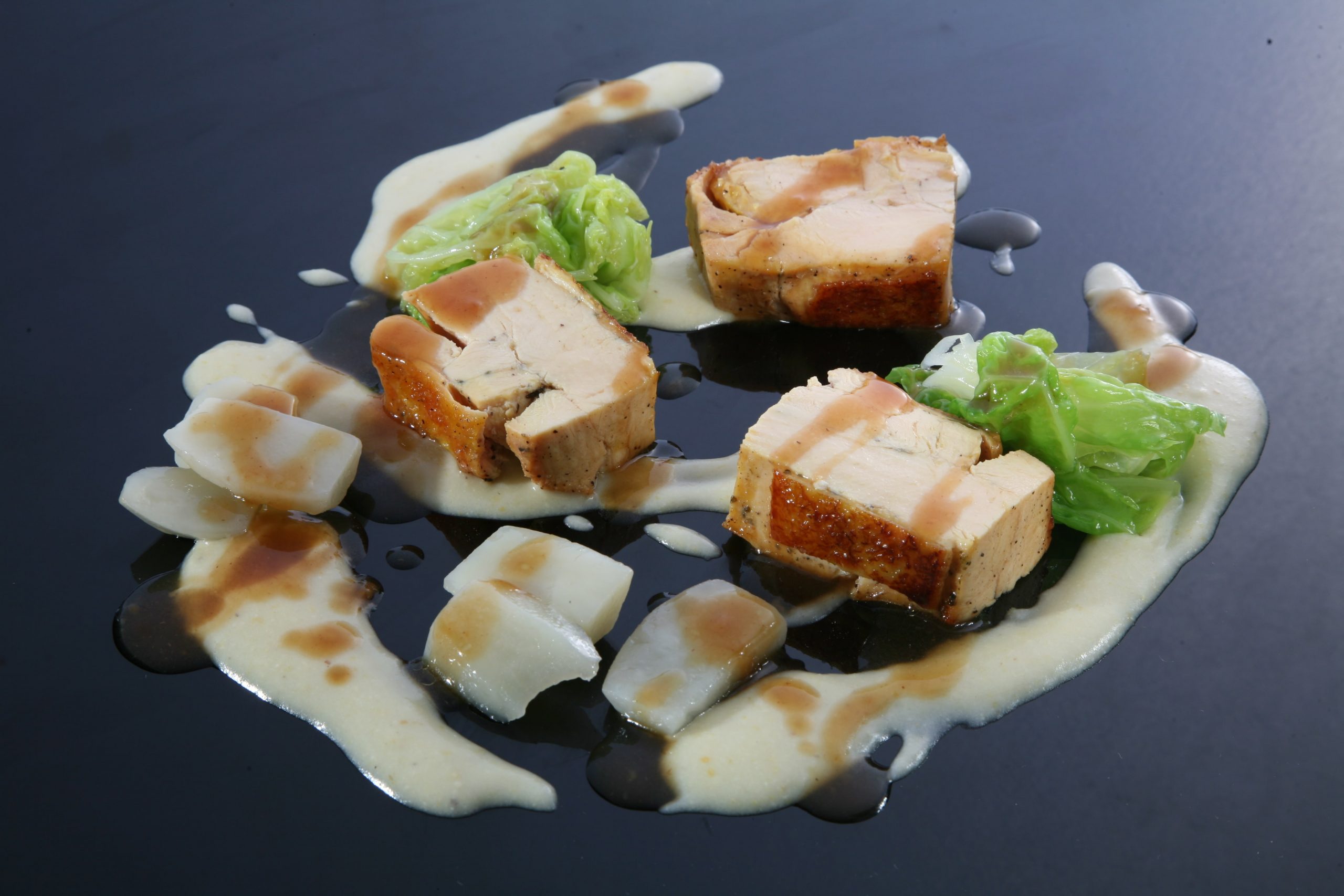Galletto ruspante, crema di lattuga, topinambur, castagne, pioppini e timo