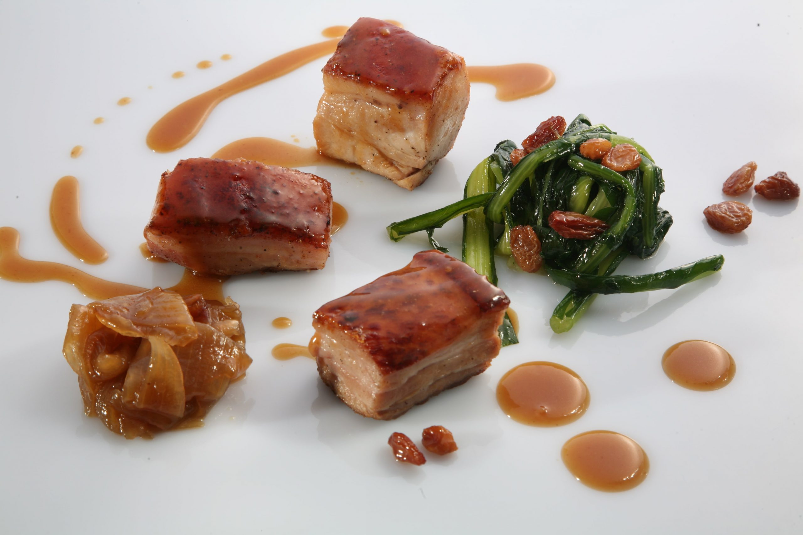 Maialino da latte alla senape in grani con catalogna, uvetta e cipolle al miele