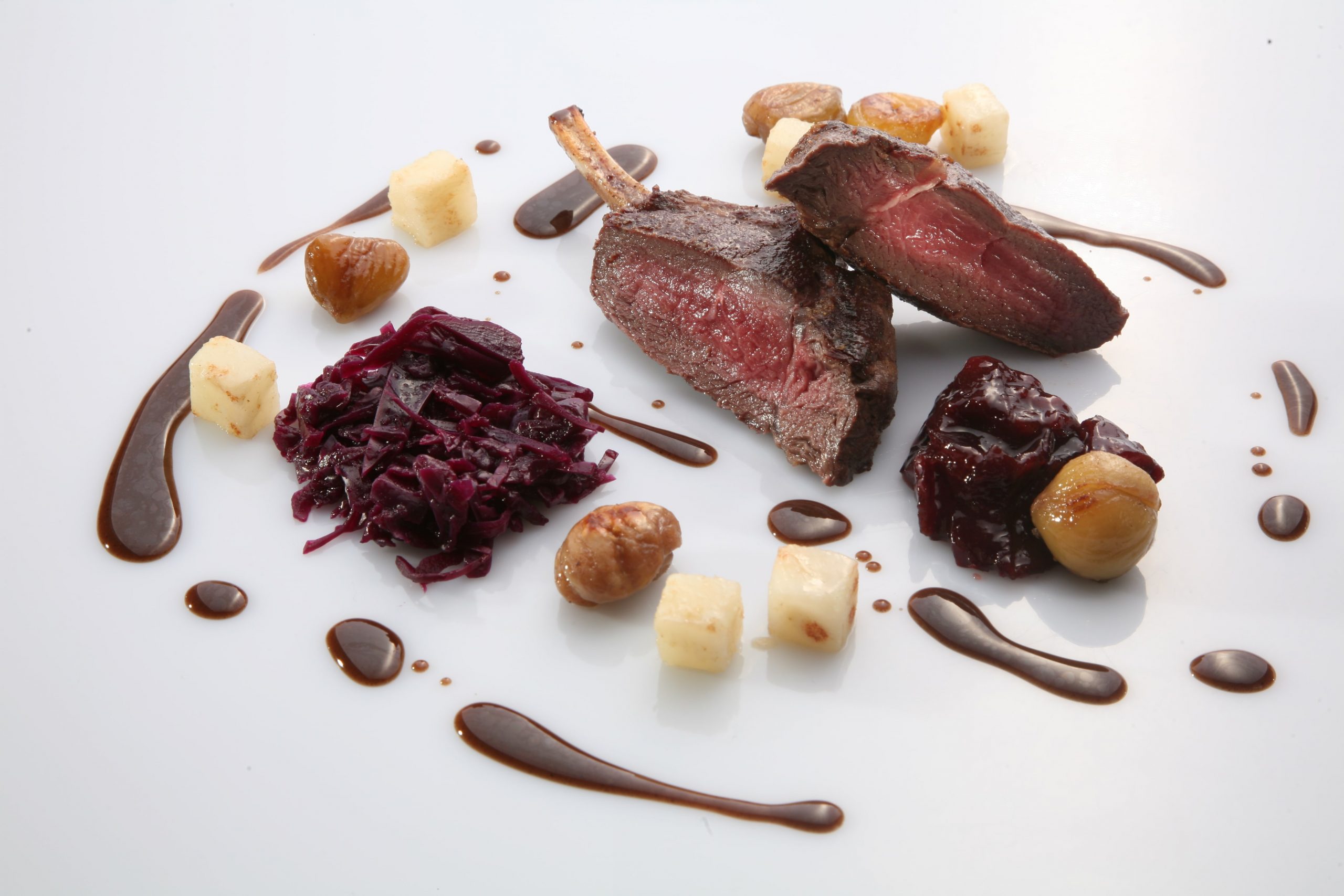 Costoletta di cervo al vino rosso, verze, biscotto al grano saraceno, crema di patate e Casera