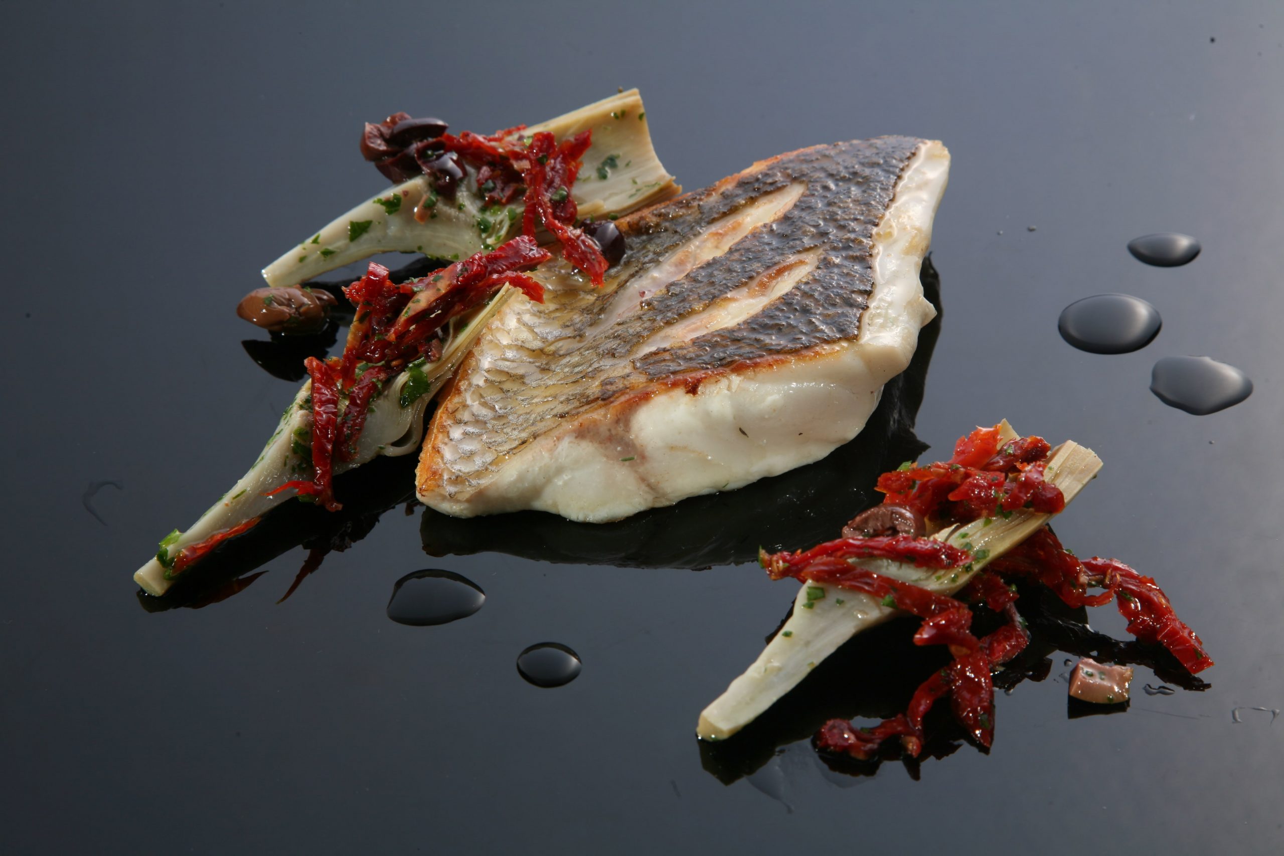 Branzino con carciofi, pomodori appassiti e olive taggiasche