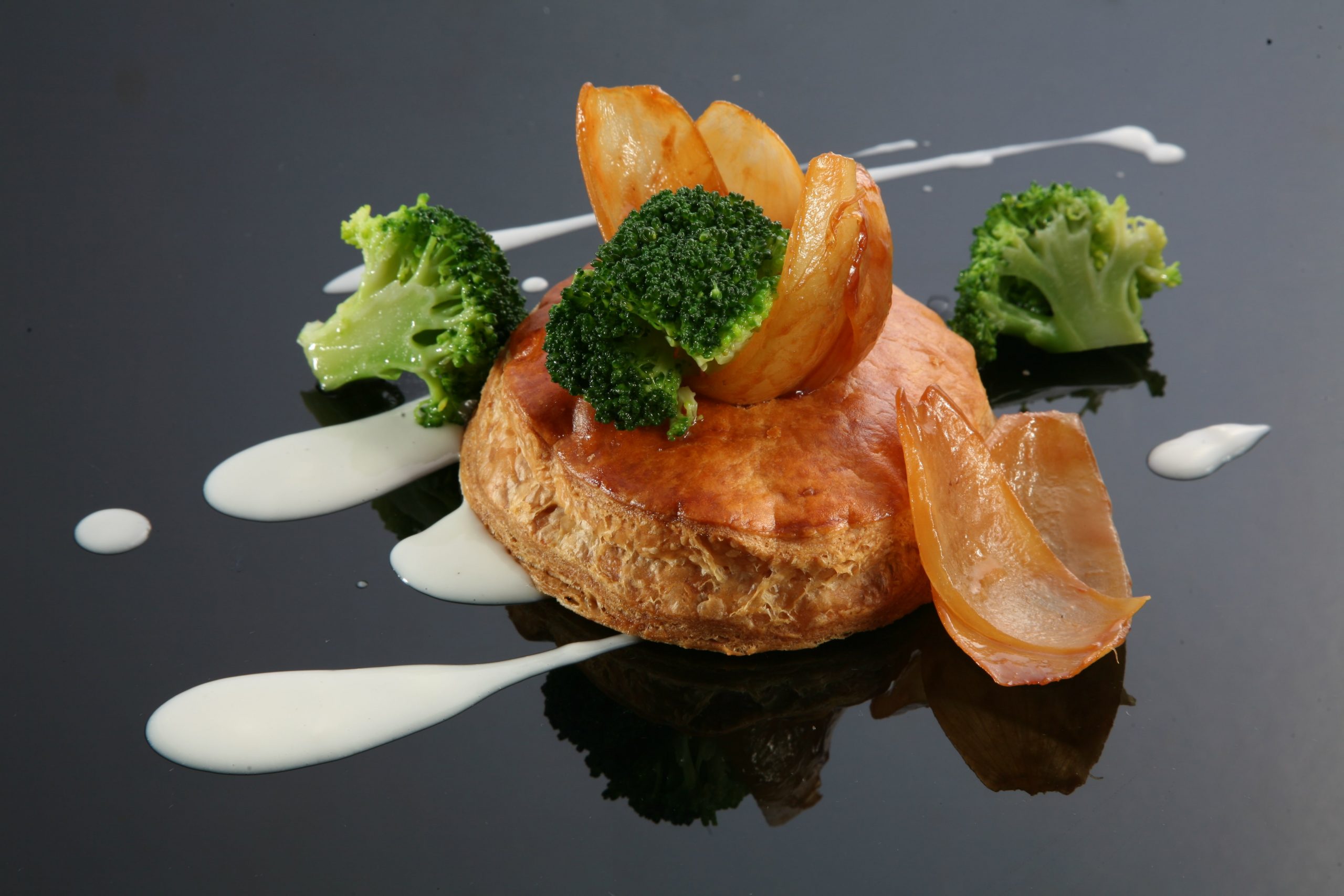 Sfoglia di cipolle caramellate, broccoli e fonduta di Taleggio